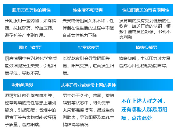以上人群出现勃起功能障碍时应积极应对,不少患者应未对阳痿正确认识或羞于启齿选择自行服药或偏方治疗,以至于误治+拖延引起不良后果。而一些患者未到正规医院就诊,特别是容易把阳痿和早泄病情弄混淆,以至于出现误诊案例。而据临床接诊患者来看,只有选择专业正规医院检查就诊才会有更高的康复率。>>>阳痿该怎么治才好?问问在线医师